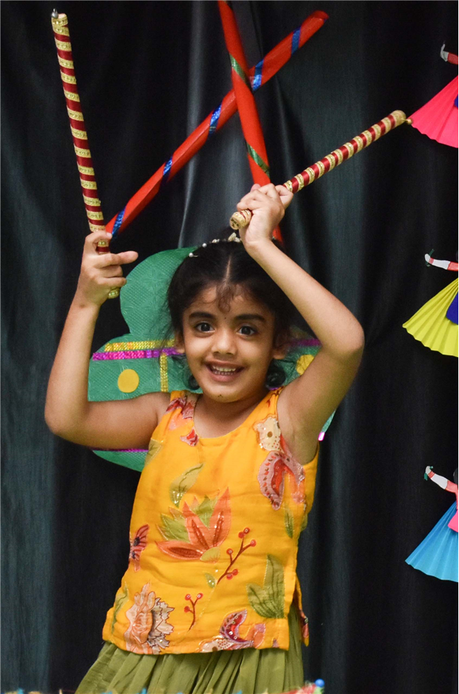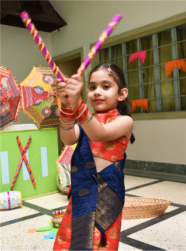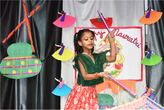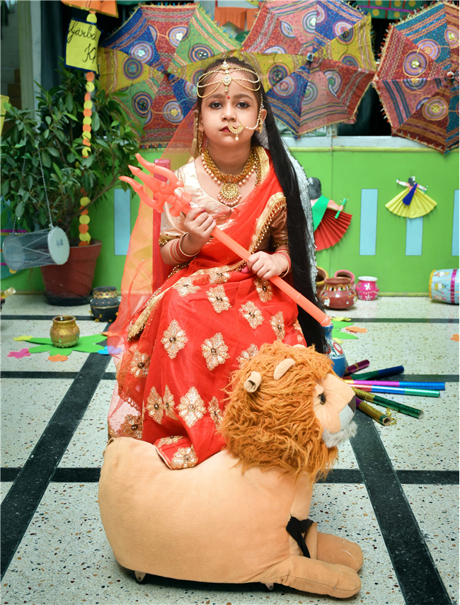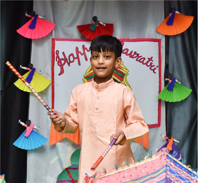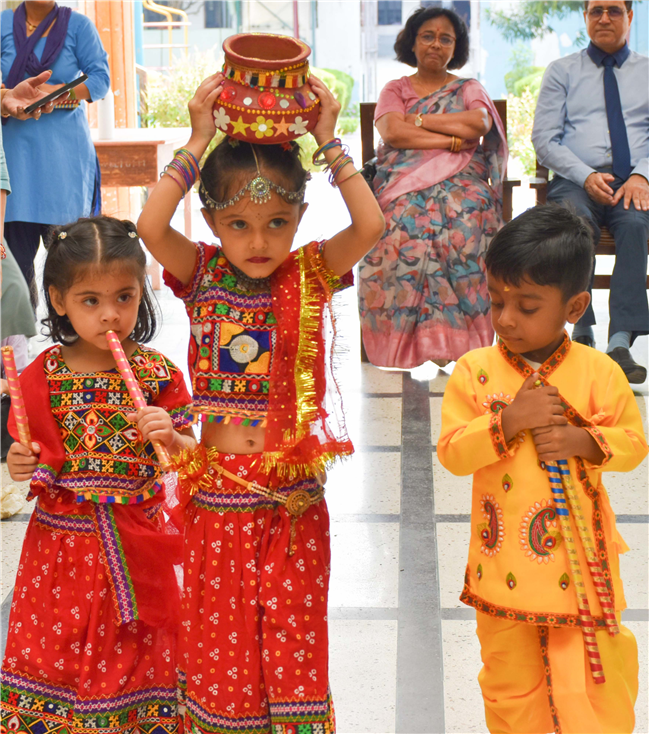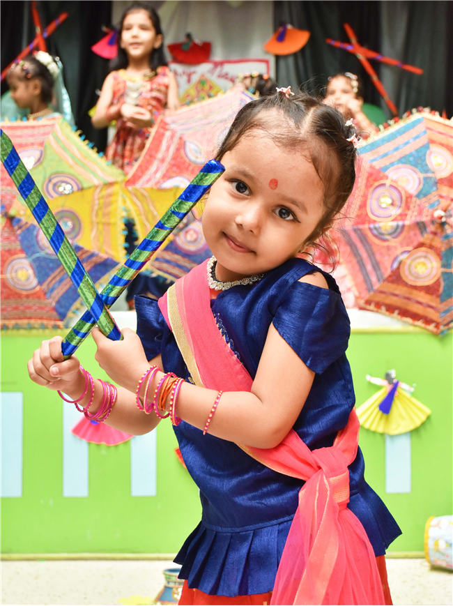 Navratri was a vibrant showcase of culture and community, as our young stars of our Pre-Primary Wing donned colourful traditional attire that embodied the spirit of the festivities. The atmosphere was alive with enthusiasm, music, and laughter, creating a dynamic environment where children danced joyfully in circles. The smiles on their faces reflected a genuine happiness, underscoring the importance embracing cultural heritage.