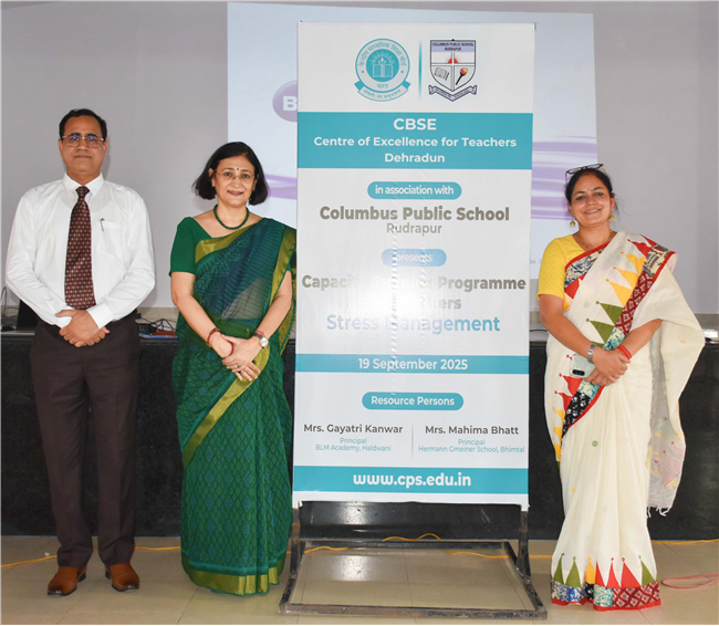 in collaboration with CBSE Centre of Excellence, Dehradun, hosted an insightful capacity building workshop for the teachers, focused on the vital theme of Stress Management. The event featured distinguished speakers, Dr. Gayatri Kanwar (Principal, BLM Academy, Haldwani) and Mrs. Mahima Bhatt (Principal, Hermann Gmeiner SOS School, Bhimtal) , both of whom brought a wealth of knowledge and experience to the table, guiding participants through an engaging and interactive learning experience.